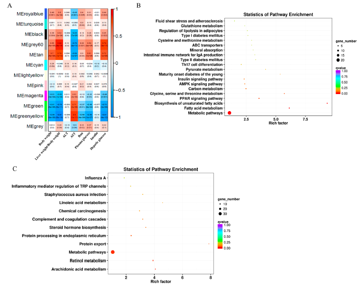 使用DEGs進(jìn)行WGCNA分析以確定共表達(dá)模塊及其與臨床特征的相關(guān)性。確定了12個共表達(dá)模塊,并與以前報道的各種臨床特征(體重、AST、ALT、血尿素氮、血糖和胰島素)相關(guān)(圖7A)。MEgery 60和MEtan模塊與體重、肝重/體重比、血糖、肝糖呈正相關(guān),與天冬氨酸轉(zhuǎn)氨酶呈負(fù)相關(guān)。MEgreen和MEgreenyellow模塊與體重、肝重/體重比、血糖、肝糖呈負(fù)相關(guān),與AST值呈正相關(guān)。