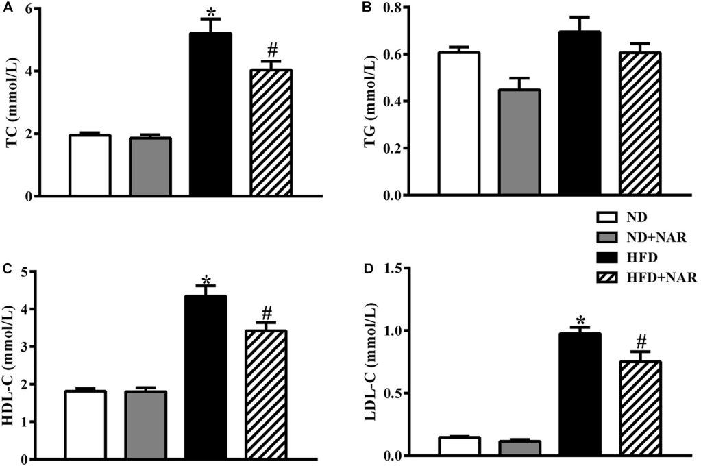 圖2為四組小鼠血脂結(jié)果。與對照相比,HFD組小鼠TC、HDL-C和LDL-C水平升高,提示HFD組血脂代謝異常。補(bǔ)充NAR可以預(yù)防HFD引起的高血脂,四組間血清TG水平差異不顯著。