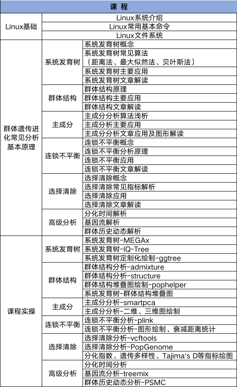應各位老師需求,百邁客特開辦遺傳進化生信分析培訓班,面向全體科研工作者,系統(tǒng)學習遺傳進化中常規(guī)內容,并重點進行高級圖形繪制。課程設計覆蓋基因流、分化時間、群體歷史動分析三塊當前熱點研究內容。