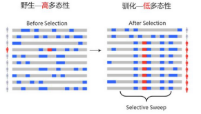 自然選擇促使有利突變在群體中保留下來,與之連鎖的中性位點突變頻率提升,非連鎖的中性位點突變頻率下降;簡單的說就是基因組某區(qū)域由于受到了選擇而消除多態(tài)性,即遺傳多樣性降低,在群體中出現(xiàn)高頻的等位基因和低頻的等位基因。