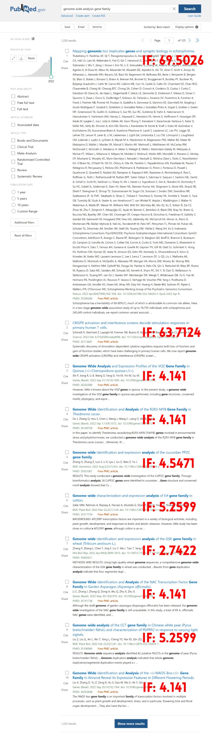 我們統(tǒng)計在2021年發(fā)表了1319篇相關(guān)的基因家族文章,而2022年到目前已經(jīng)發(fā)表了1241篇(使用genome wide of gene family關(guān)鍵詞檢索)??梢钥吹交蚣易逦恼逻@種套路文章發(fā)文之大。且如果進化做的好,可以分析一個基因家族在多個物種中演化規(guī)律,即可發(fā)更高水平的文章。