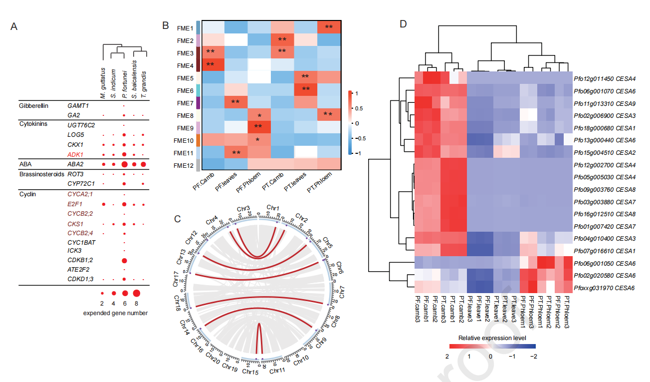 植物的形態(tài)發(fā)生和生長速率可能歸因于細胞增殖和分裂、細胞壁形成以及光合效率或其他生物過程的增強。細胞分裂素生物合成中的四個基因家族和細胞周期調(diào)控中的十個基因家族,通過串聯(lián)基因復制或最近的WGD發(fā)生顯著擴增(圖2A)。在泡桐屬植物中,白花泡桐(PF)的生長速度遠遠快于毛泡桐(P. tomentosa,?PT)。約85%的毛泡桐基因cDNA可定位于白花泡桐基因組,因此對白花泡桐和毛泡桐的葉片、樹干韌皮部和樹干形成層進行了比較轉(zhuǎn)錄組學分析。WGCNA分析得到12個潛在快速生長相關(guān)ME(FME1~12),F(xiàn)ME3與毛泡桐和白花泡桐形成層的生長發(fā)育相關(guān)(圖2B)。FME3模塊包括42個參與植物激素途徑或參與細胞周期調(diào)控的基因。FME4僅在白花泡桐中與形成層生長和發(fā)育高度相關(guān)(圖2B),這個模塊中有五個基因與激素信號有關(guān),其中包括參與細胞分裂素代謝的腺苷激酶1,且這些基因在白花泡桐中顯著擴增。通過基因的表達及拷貝數(shù)分析表明,CESAs、Csls和木質(zhì)素生物合成基因可能在白花泡桐的發(fā)生中起作用(圖2D)。