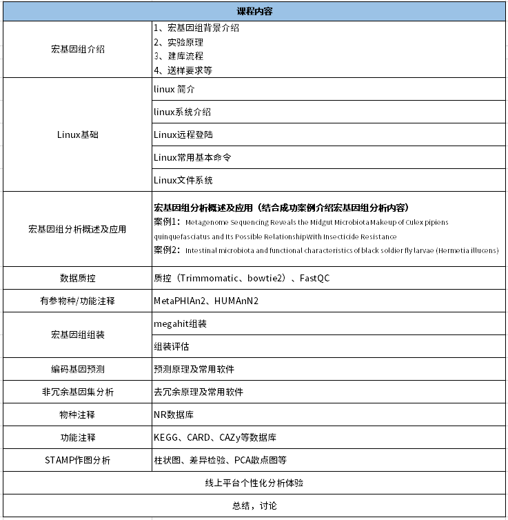 本課程從宏基因組背景介紹、實驗(實驗測序原理、建庫方法和流程、送樣注意事項等)、分析(下機數(shù)據(jù)質(zhì)控、有參注釋、無參組裝/預測/物種注釋/功能注釋等)、可視化作圖,讓您全面了解宏基因組分析每個過程,并結(jié)合案例文章,讓您了解宏基因組文章思路,助力科學研究。
