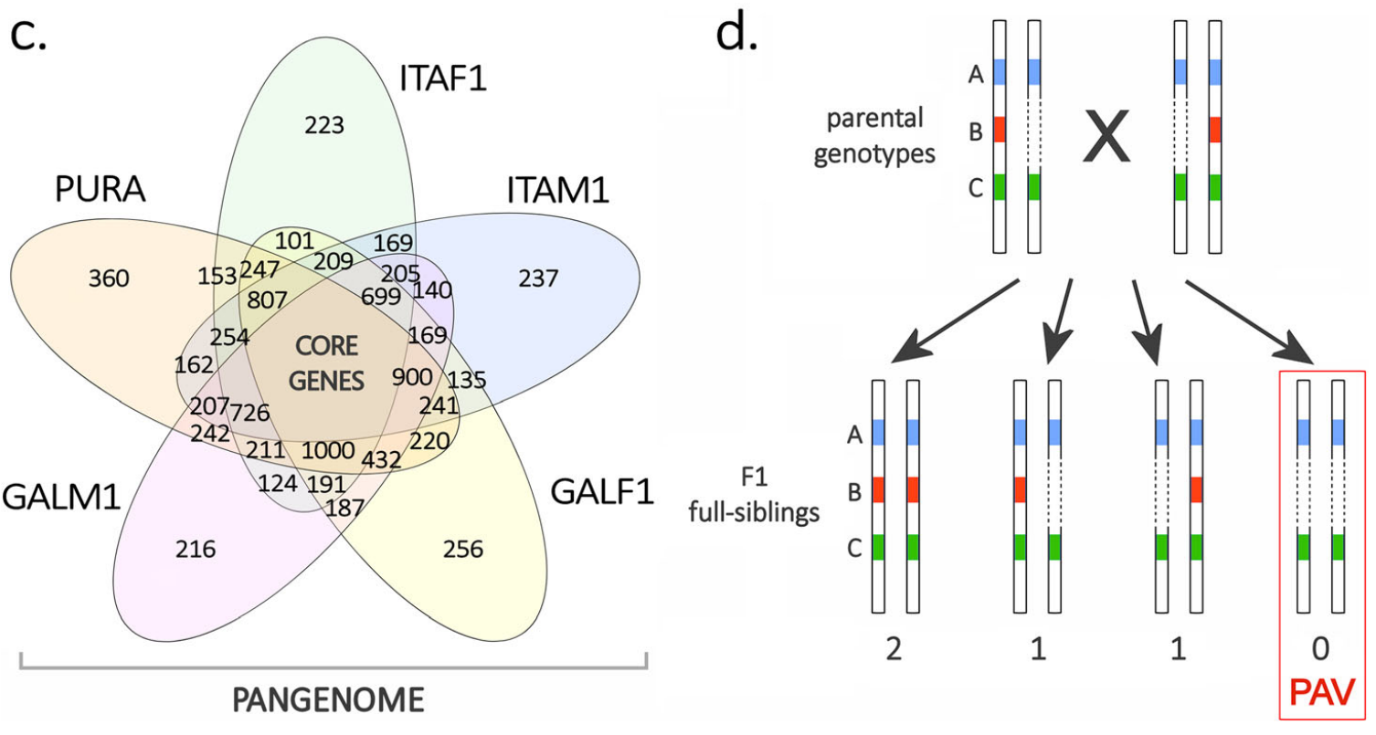 這些發(fā)現(xiàn)說明一個(gè)物種內(nèi)的基因組可能以更顯著的方式存在差異(包括結(jié)構(gòu)變異(SV)的多樣性),這些變異可能包含一個(gè)或多個(gè)基因。而大量研究表明,SV在重要農(nóng)藝性狀上發(fā)揮關(guān)鍵作用(例如抗生物脅迫和非生物脅迫、開花時(shí)間、植物結(jié)構(gòu)、產(chǎn)量、籽?;蚬麑?shí)品質(zhì)(Tao Y et al., 2019)。這些結(jié)果意味著一個(gè)物種的功能基因含量比以前想象的要更為多變。