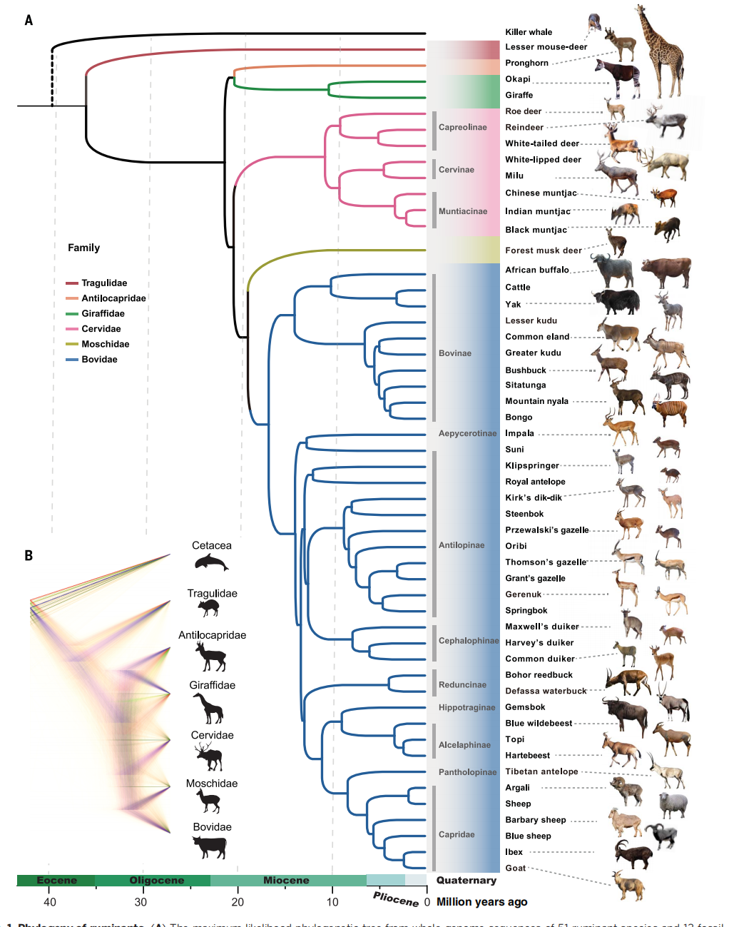 同樣這樣大規(guī)模不同科屬研究的還有2020年Nature封面文章,通過6種蝙蝠基因組揭示演化和潛在功能,探索蝙蝠有別于其他哺乳動(dòng)物的免疫調(diào)節(jié)機(jī)制。以及2020年發(fā)表在Science上的反芻動(dòng)物基因組,該研究共進(jìn)行了6個(gè)科的44個(gè)反芻動(dòng)物De novo組裝,結(jié)合化石信息,構(gòu)建了所有節(jié)點(diǎn)100%支持的全基因組系統(tǒng)發(fā)育樹,高置信度的進(jìn)化樹進(jìn)一步確認(rèn)了叉角羚科與長頸鹿科的姐妹類群關(guān)系,以及麝科與??平忝妙惾宏P(guān)系等一直以來備受爭議的分類問題。并對(duì)反芻動(dòng)物基因組結(jié)構(gòu)特征及演化進(jìn)行研究,進(jìn)而對(duì)反芻動(dòng)物中的“消化系統(tǒng)”“多腔胃演化”“角形態(tài)”“體型”等特征進(jìn)行解析。該研究基于大量的基因組數(shù)據(jù),將反芻動(dòng)物基因功能與動(dòng)物的適應(yīng)性性狀聯(lián)系起來,為動(dòng)物譜系基因組打開了一個(gè)新的研究篇章。