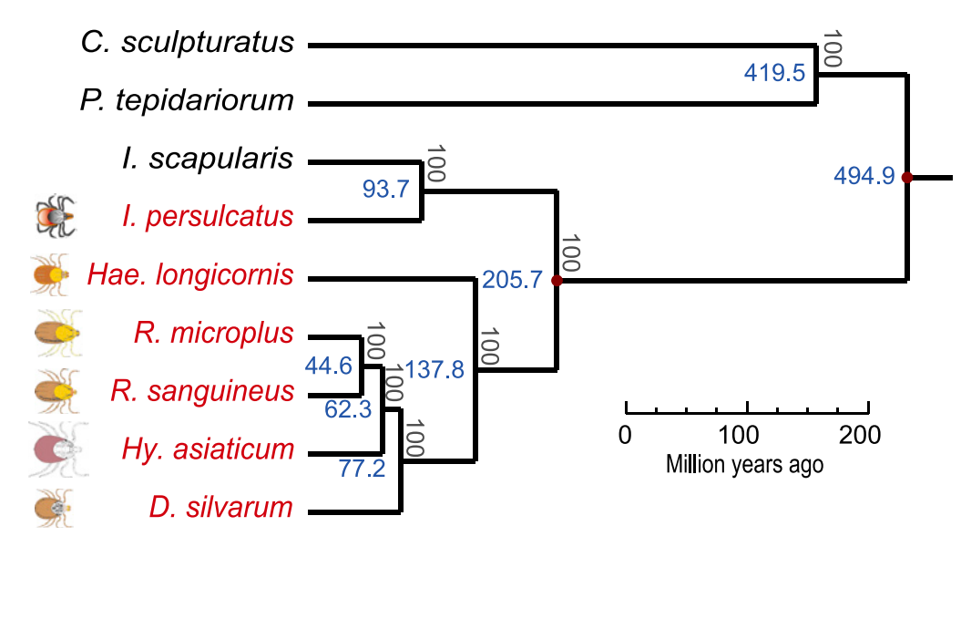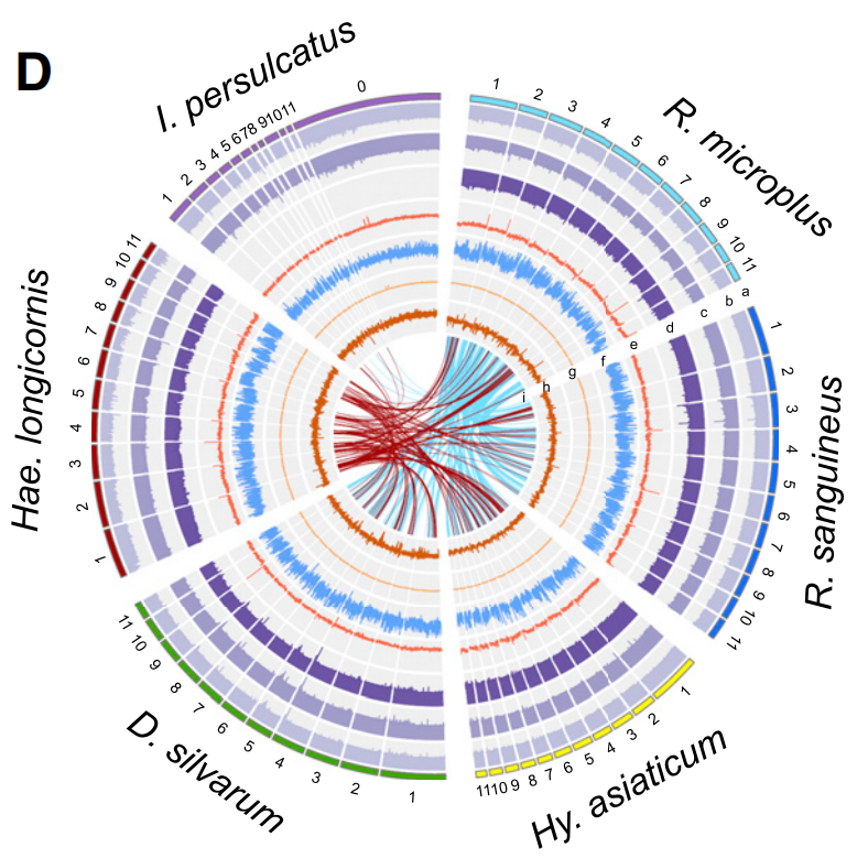 除了上述跨越科水平的譜系基因組研究,其實(shí)還有很多同科內(nèi)不同屬間的動(dòng)物群體基因組。例如通過構(gòu)建硬蜱科內(nèi)6種蜱蟲基因組,解析不同蜱種的演化歷程,揭示了蜱專性吸血的遺傳機(jī)制以及蜱蟲遺傳多樣性及分布規(guī)律,并通過宏基因組學(xué)研究等方式探究了蜱媒病原體的生態(tài)分布和進(jìn)化機(jī)制(Jia N et al., Cell.2020)。
