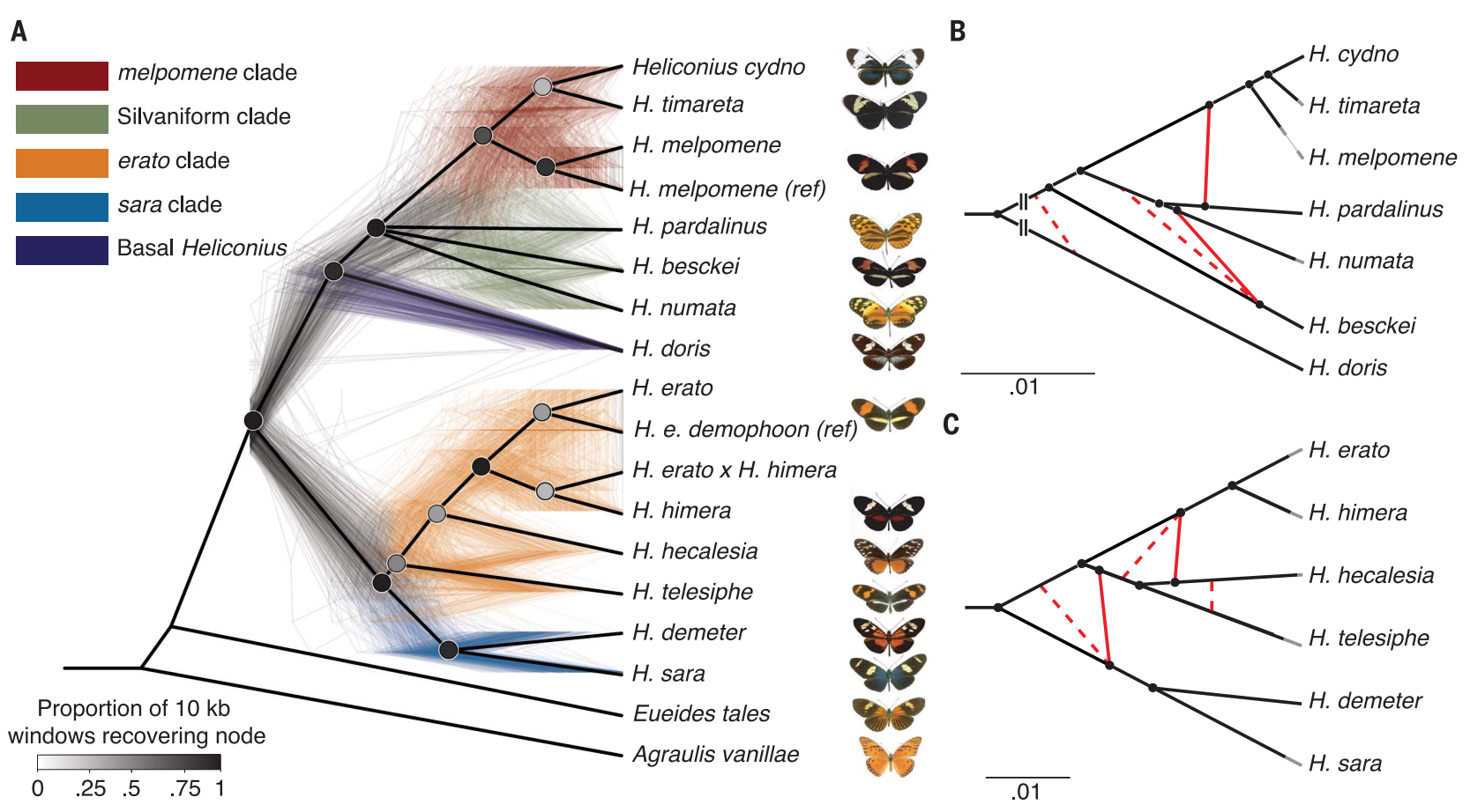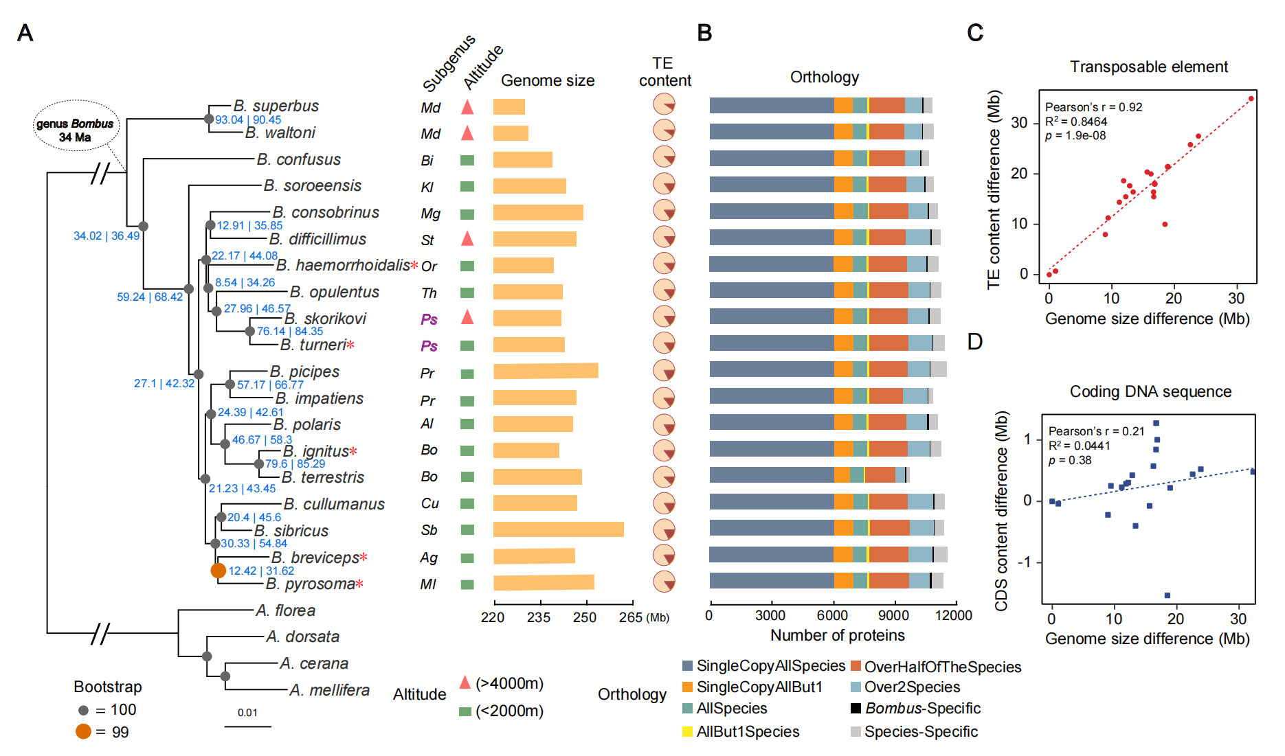 針對(duì)于同一個(gè)屬內(nèi)不同種之間的研究,由于其間親緣關(guān)系相對(duì)較近,基因組間相似度較高,往往是對(duì)其基因結(jié)構(gòu)特征差異、轉(zhuǎn)座子分析、屬內(nèi)分類研究、基因組間的基因漸滲現(xiàn)象、大型結(jié)構(gòu)變異挖掘、基因正選擇分析上進(jìn)行。例如,作者通過構(gòu)建20個(gè)新的袖蝶屬基因組揭示基因滲入和不完全譜系分選的作用(Edelman N B et al.,Science.2020)、通過15個(gè)亞屬的17種熊蜂基因組確定了關(guān)鍵生態(tài)和取食偏好等行為特征相關(guān)的變異(Sun C et al.,Mol Biol Evol.2020)。