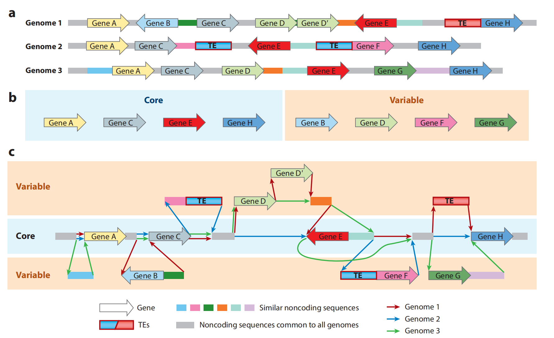 因此對(duì)于一個(gè)物種來說,如果只使用單一的參考基因組進(jìn)行遺傳馴化變異的研究,可能會(huì)丟失掉很多有意義的基因信息。以上種種因素,共同推動(dòng)了動(dòng)植物泛基因組的構(gòu)建與研究。