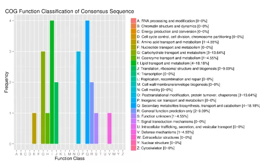 在COG富集分析中橫軸代表功能分類,縱軸代表基因頻數(shù)。