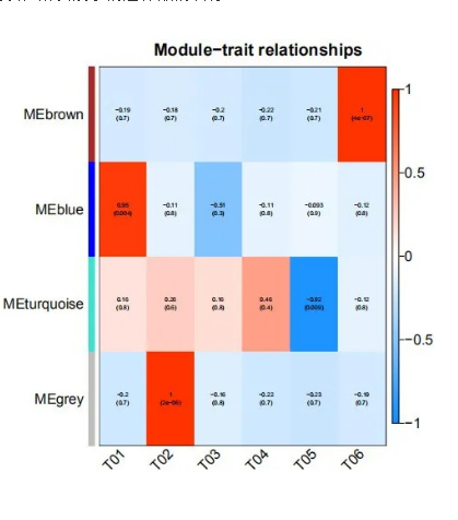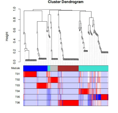 基因的系統(tǒng)樹圖及性狀相關(guān)性熱圖主要分為三個部分:第一個部分為基因聚類繪制的聚類樹,分枝代表基因;第二部分為基因聚類樹根據(jù)不同的聚類對應(yīng)到的不同模塊;第三部分為性狀的熱圖,如圖中T01~T06為性狀,對應(yīng)熱圖中的顏色越深,說明該模塊中的基因與該性狀的相關(guān)性越高。