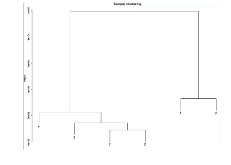 基于基因表達量的樣本系統(tǒng)聚類樹: 在聚類中歐氏距離求兩點的距離,聚類中用類平均法(average)計算集合之間的距離。同一枝上的樣本具有更高的相似性。