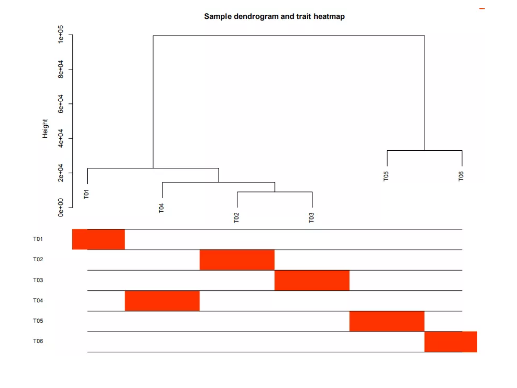 在基因表達量的樣本系統(tǒng)聚類樹的基礎(chǔ)上我們添加了熱圖,樣本與性狀之間的相關(guān)性越高熱圖中模塊顏色也會越深。例如我們將熱圖左邊的T01看作是性狀標簽,它與分支樣本TP01的熱圖模塊呈現(xiàn)紅色,說明性狀T01與樣本T01的相關(guān)性非常高。