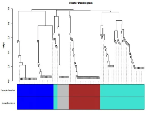 基因網(wǎng)絡(luò)模塊主要分為三個部分:第一部分為基因的聚類樹;第二部分為根據(jù)基因聚類樹劃分的不同模塊;第三部分為根據(jù)第二部分模塊進行了矯正,最后結(jié)果為校正后的模塊。