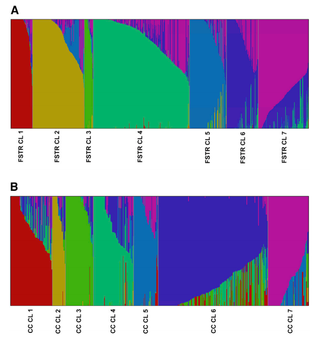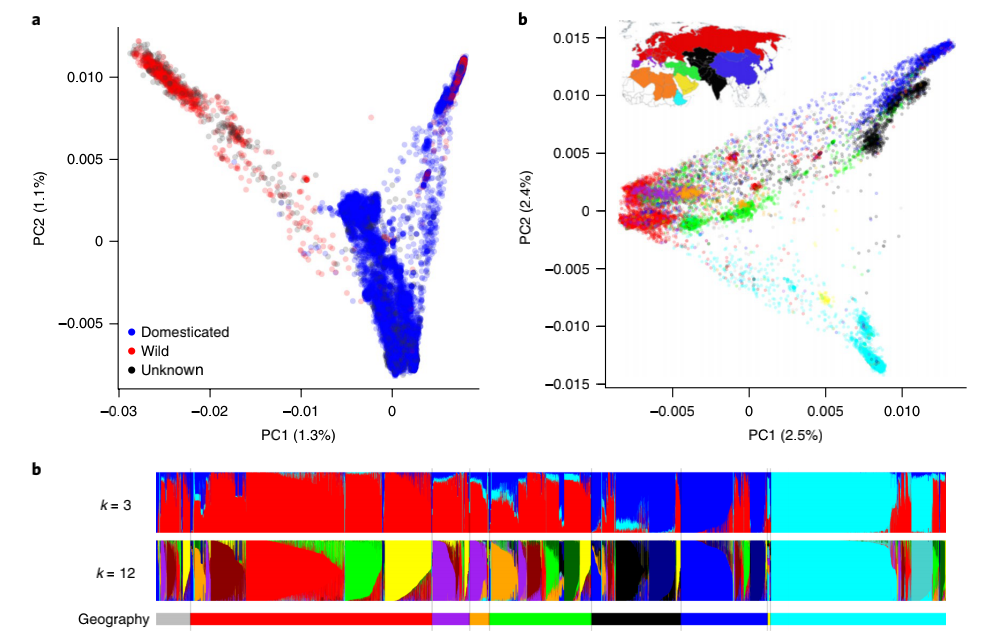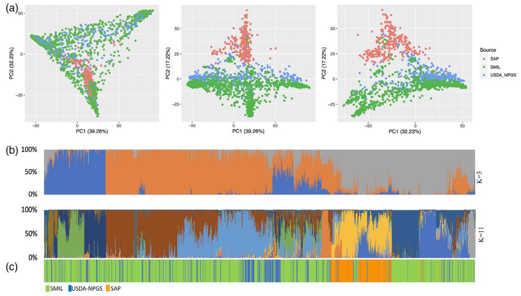 基因庫收集和保存大量植物和詳細的護照信息,目的是保護遺傳多樣性以進行保護和育種。此類集合的遺傳表征有可能闡明重要作物的遺傳歷史,使用標記-性狀關聯(lián)來鑒定感興趣性狀的位點,尋找正在進行選擇的位點,并通過識別分類錯配和重復為基因庫管理作出貢獻。本研究通過GBS測序?qū)碜匀蚧驇斓?0,038個辣椒 (Capsicum spp.) 種質(zhì)進行基因分型,并調(diào)查了這種標志性主食的近期歷史?;赟NP數(shù)據(jù)計算了identity-by-state (IBS) 比例,在基因庫內(nèi)和基因庫之間檢測到多達 1,618 個重復種質(zhì)。進一步深入分析了常見食用辣椒的遺傳多樣性以調(diào)查其歷史,發(fā)現(xiàn)在全球廣泛地區(qū)收集的辣椒種類有很大的重疊。GWAS分析和選擇清除分析發(fā)現(xiàn)辣椒性狀,如刺激性,這些性狀在全球分布不均勻,表明人類偏好對馴化辣椒的遺傳結(jié)構(gòu)產(chǎn)生了主要影響。