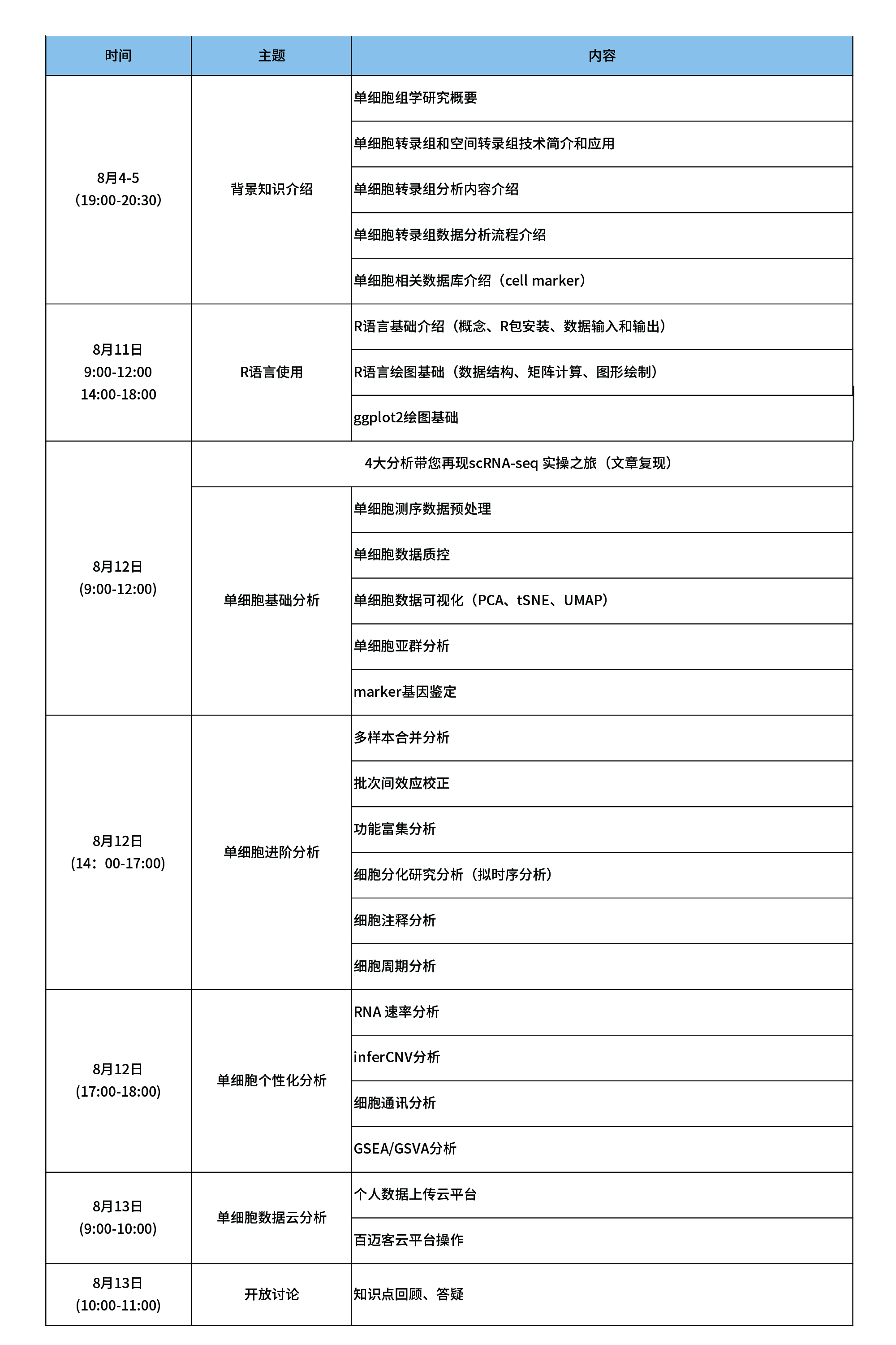 細胞和空間組學技術的快速發(fā)展正在開啟生命科學的時空多維新時代,為復雜疾病的細胞異質(zhì)性研究提供新視角,引領了生物學從“時間”維度走向“空間”維度,廣泛應用于動植物生長發(fā)育、腫瘤精準治療研究等方向。為了促進單細胞數(shù)據(jù)挖掘和分析,百邁客特開展的單細胞數(shù)據(jù)分析課程,將為您呈現(xiàn)細胞分群、細胞分化研究、marker基因鑒定等分析內(nèi)容,幫助研究者實現(xiàn)了單細胞數(shù)據(jù)更快、更準、更高的分析轉(zhuǎn)化。