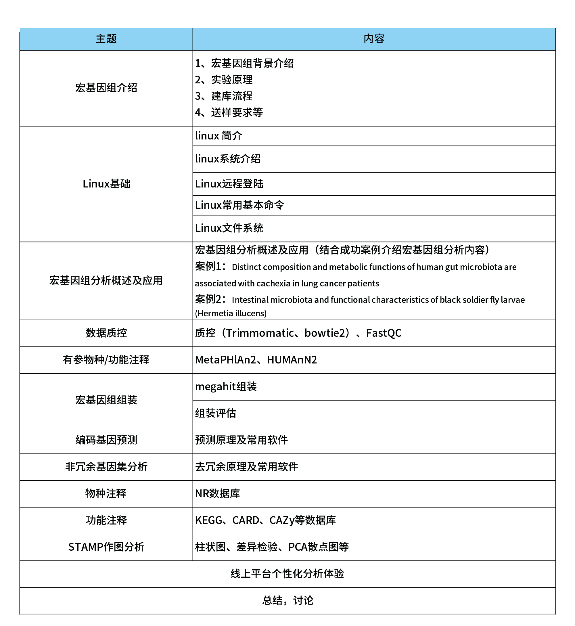 本課程從IF = 10及4分的SCI文章入手,從宏基因組背景介紹、實驗(實驗測序原理、建庫方法和流程、送樣注意事項等)、分析(下機數(shù)據(jù)質(zhì)控、有參注釋、無參組裝/預測/物種注釋/功能注釋等)、可視化作圖,讓您全面了解宏基因組分析每個過程,并結(jié)合案例文章,讓您了解宏基因組文章思路,助力科學研究。