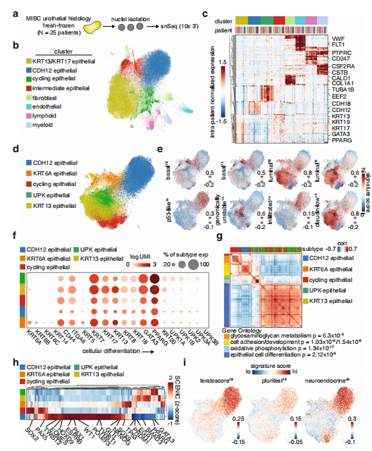 為了實現(xiàn)表征腫瘤內(nèi)異質(zhì)性的第一個目標,作者首先基于sn-RNAseq細胞類型比例研究了MIBC腫瘤的總體細胞組成(圖1a)。腫瘤由約90%的上皮細胞、5%的免疫細胞、3%的成纖維細胞和2%的內(nèi)皮細胞組成,這些細胞根據(jù)相應(yīng)的角蛋白、PTPRC、膠原蛋白、PECAM1、VWF等關(guān)鍵標記基因(圖1b)。上皮間室無監(jiān)督聚類識別到了一個KRT13和KRT17差異表達的類群,KRT13、uroplakins(UPK)、KRT6A細胞周期相關(guān)基因類群,以及表達CDH12和其他上皮標記物的細胞群(圖1d)。KRT13和UPK人群是僅有的兩個缺乏來自免疫浸潤MIBC的基因標記的人群,這表明在這些人群中富集的腫瘤代表免疫“冷”腫瘤(圖1e)。進一步交叉參照傳統(tǒng)的尿上皮分化相關(guān)標記表明,KRT13和UPK群體代表一個更分化的表型,而CDH12、KRT6A和cycle群體代表一個未分化或去分化的表型(圖1f)。如預(yù)期一樣KRT13和UPK群體表達了一個上皮細胞分化網(wǎng)絡(luò)(圖1g)?;趩渭毎{(diào)控網(wǎng)絡(luò)推斷和聚類分析,預(yù)測CDH12群體表現(xiàn)出多種發(fā)育相關(guān)轉(zhuǎn)錄因子的高活性,包括NANOG、EOMES、PAX1和HOXD9(圖1h)。CDH12和循環(huán)群體在干-樣和神經(jīng)內(nèi)分泌基因標簽得分也高(圖1i)。