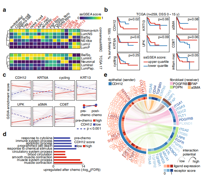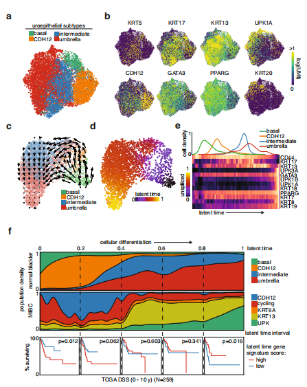 上皮細胞的無監(jiān)督聚類分為基礎(chǔ)、過渡和傘部類群(圖2a)。有趣的是CDH12群體與后一類典型群體明顯不同,而過渡群體的KRT13和KRT17表達水平最高(圖2b)。確定了一個始于基礎(chǔ)細胞的軌跡,隨后分化為兩種途徑:一種貫穿CDH12群體,一種跳過CDH12群體(圖2c和d)。關(guān)鍵的尿上皮分化標記物沿著這條路徑跟蹤,在起始階段CD44高表達,隨后中間是KRT13和KRT17,終點站為UPK1A、GATA3、PPARG(圖2e)。所有4個正常樣本的擬時序分析顯示出相似的路徑,CDH12群位于起始點附近(圖2f)。為了確定CDH12腫瘤細胞與正常腫瘤細胞之間的轉(zhuǎn)錄相似性,并推斷它們在正常上皮細胞分化軌跡上的位置,作者使用表達相似性,確定了每個MIBC上皮細胞中最接近的正常細胞,然后給腫瘤細胞分配相應(yīng)的正常潛伏期(圖2f)。值得注意的是,最未分化表型對應(yīng)的間隔得分預(yù)測了較差的疾病特異性生存(DSS),而最分化表型對應(yīng)的間隔得分預(yù)測了較好的DSS,中間的間隔得分顯示了相反結(jié)果之間的過渡(圖2f)。