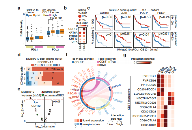 術(shù)前新輔助化療(NAC)和免疫檢查點治療(ICT)已經(jīng)徹底改變了膀胱癌的治療。然而,從這些模式中獲益最多的患者分層仍然是一個主要的臨床挑戰(zhàn)。作者將人類膀胱癌的單細胞核轉(zhuǎn)錄組、空間轉(zhuǎn)錄組和單細胞分辨率的空間蛋白組聯(lián)合分析,確定具有治療反應(yīng)預(yù)測能力的上皮細胞亞群。這些細胞表達Cadherin12(CDH12,N-Cadherin 2?)、catenins和其他上皮細胞的標志物。CDH12富集的腫瘤可以定義患者是否接受NAC治療后預(yù)后效果差。富集CDH12的腫瘤對ICT表現(xiàn)出更好的效果。在所有情況下,通過對腫瘤CDH12富集進行患者分層比目前膀胱癌亞型能更好的預(yù)后預(yù)測。CDH12群體類似于一種未分化的狀態(tài),具有固有的侵略性生態(tài)學,包括化學耐藥性可能是通過祖細胞樣基因表達和成纖維細胞激活介導(dǎo)的。CDH12富集細胞表達PD-L1和PD-L2以及耗竭T細胞共定位,可能通過CD49a(ITGA1)介導(dǎo),為ICT在腫瘤中的功效提供一種解釋??傊?,本研究描述了一個對膀胱癌治療具有反向應(yīng)答的癌細胞群。重要的是還為臨床標志物的篩選提供了一個令人信服的框架。