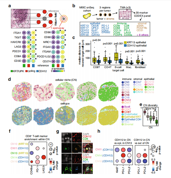 為了驗證CDH12上皮細胞引起T細胞假說,作者使用Visium空間轉(zhuǎn)錄組和單細胞核轉(zhuǎn)錄組研究腫瘤中基因表達定位。CDH12富集的區(qū)域也富集了CD8T細胞marker和ITGA1(圖5a)。為了驗證CDH12上皮細胞在單細胞水平上與T細胞共定位,作者設(shè)計并使用CODEX平臺對同一腫瘤隊列的腫瘤組織微陣列進行了35位免疫組化檢測(圖5b)。