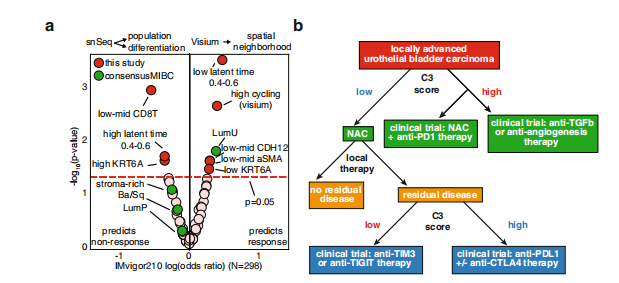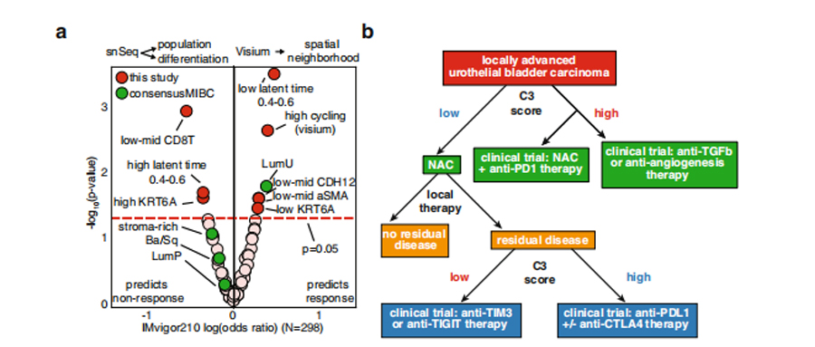 膀胱癌患者接受免疫治療后預(yù)后效果的好壞仍然是臨床上面臨的一個主要的挑戰(zhàn)。近期NC一篇文章通過單細轉(zhuǎn)錄組及空間轉(zhuǎn)錄組闡述了對膀胱癌治療具有反應(yīng)應(yīng)答的癌細胞群。獲得了在預(yù)測對免疫治療的反應(yīng)方面更優(yōu)的marker基因。有助于為患者的治療提供更理想更優(yōu)的治療方案。