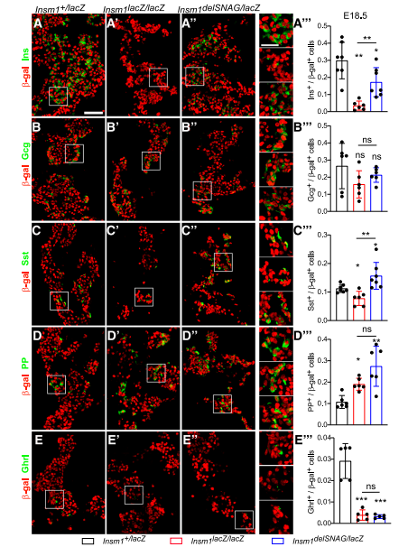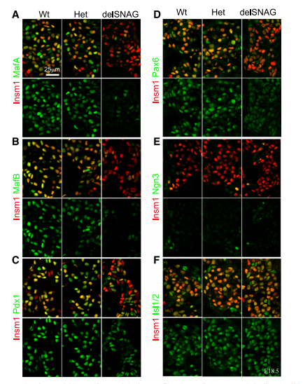 本研究的目的是確定Insm1的SNAG域在胰腺內(nèi)分泌細(xì)胞的發(fā)育中的特異功能。特別是分析了Insm1delSNAG/lacZ(Insm1delSNA突變體),Insm1lacZ/lacZ (Insm1 null突變體)和Insm1+/lacZ(對(duì)照) 同窩出生小鼠胚胎的免疫熒光。