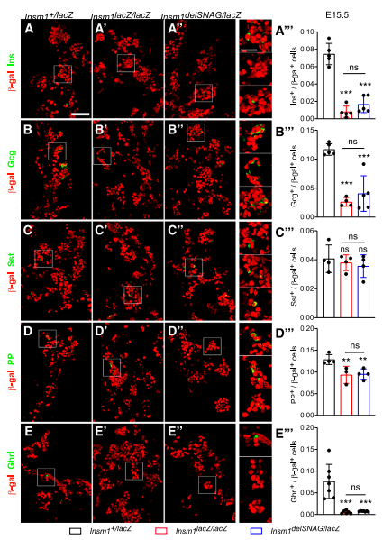 為了確認(rèn)這些減少現(xiàn)象是否發(fā)生在早期發(fā)育階段(即E15.5),檢測(cè)了胰腺E15.5的內(nèi)分泌系統(tǒng)。結(jié)果與對(duì)照相比,Insm1delSNAG和Insm1-null突變體中在觀察到一個(gè)類(lèi)似的減少現(xiàn)象,包括胰島素,胰高血糖素,PP-和饑餓素陽(yáng)性細(xì)胞(圖2)。然而,生長(zhǎng)抑素陽(yáng)性細(xì)胞的數(shù)量在Insm1delSNAG或Insm1-null突變體中都沒(méi)有發(fā)生改變(圖2C–C”)。因此,Insm1delSNAG突變體中δ細(xì)胞數(shù)量的增加發(fā)生在E18.5,而不在E15.5。