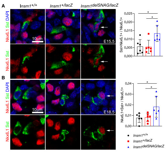 生長(zhǎng)抑素和胰島素或胰高血糖素的復(fù)合染色很少被觀察到,且在Insm1delSNAG突變體和對(duì)照小鼠之間沒(méi)有發(fā)現(xiàn)差異。但是在E15.5和E18.5時(shí)Insm1delSNAG突變體中,檢測(cè)到Sst和β細(xì)胞特異性轉(zhuǎn)錄因子Nkx6.1的復(fù)合染色信號(hào)增強(qiáng)(圖6A、B)。Sst與Nkx6.1的共表達(dá)表明Insm1delSNAG中δ細(xì)胞有可能會(huì)從β細(xì)胞轉(zhuǎn)化而來(lái)。