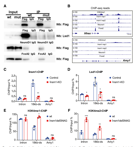在目前的研究中發(fā)現(xiàn)與Insm1null突變相比,Insm1的SNAG結(jié)構(gòu)域在α、PP和ε細(xì)胞中導(dǎo)致發(fā)育缺陷,但在β細(xì)胞中沒(méi)有那么嚴(yán)重。Insm1的SNAG突變破壞Insm1和Lsd1之間的相互作用。然而,Insm1-NeuroD1或Insm1-FoxA2的互相作用得以保留。NeuroD1和FoxA2在胰腺β細(xì)胞發(fā)育中起重要作用;Insm1delSNAG與這些因子之間相互作用的維持部分解釋了Insm1delSNAG突變小鼠β細(xì)胞發(fā)育缺陷相對(duì)于Insm1null突變小鼠不那么嚴(yán)重的原因。研究證明了Insm1的SNAG域的突變導(dǎo)致β轉(zhuǎn)分化為δ細(xì)胞。同時(shí)發(fā)現(xiàn)Insm1的SNAG結(jié)構(gòu)域與Lsd1相互作用并將其吸附到DNA上。突變的SNAG結(jié)構(gòu)域阻斷Lsd1的募集,導(dǎo)致δ細(xì)胞特異性基因Hhex位點(diǎn)的H3K4me1和H3K4me2水平升高。