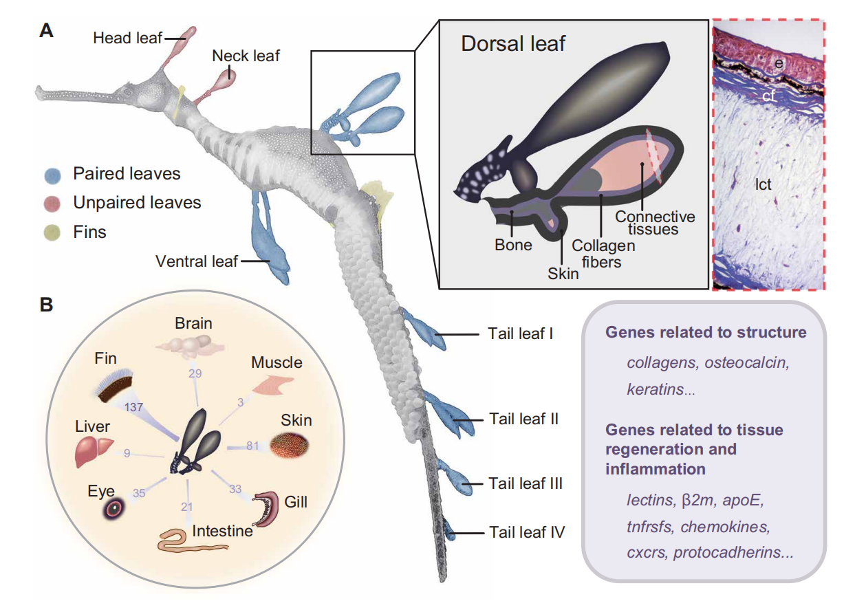草海龍的頭部、頸部、腹部、背部和尾部區(qū)域有葉子狀的附屬物,可以與周圍環(huán)境相融合,使草海龍以完美擬態(tài)隱匿于海草床中。這些結(jié)構(gòu)是該物種的一種適應(yīng)性進(jìn)化產(chǎn)物,主要由骨基質(zhì)和富含膠原纖維的結(jié)締組織組成。通過轉(zhuǎn)錄組學(xué)分析,發(fā)現(xiàn)其表達(dá)基因(如msx, dlx, fgf)主要從皮膚和鰭等器官募集而來,暗示了相關(guān)基因?qū)π缕鞴佼a(chǎn)生和維持的重要作用。而“附葉”與鰭相比缺乏肢體發(fā)育特異性的hox基因。草海龍的附葉在捕食者的襲擊中經(jīng)常受到損傷,為了研究相關(guān)機(jī)制,作者通過轉(zhuǎn)錄組分析研究發(fā)現(xiàn)在其附葉中炎癥和損傷修復(fù)相關(guān)基因表現(xiàn)出高表達(dá)水平,說明這些基因可能與其附葉的快速愈合和再生能力相關(guān)。同時(shí)草海龍?zhí)禺愋詳U(kuò)張的MHC I基因也在附葉中顯著高表達(dá),能為其提供額外的免疫保護(hù)。