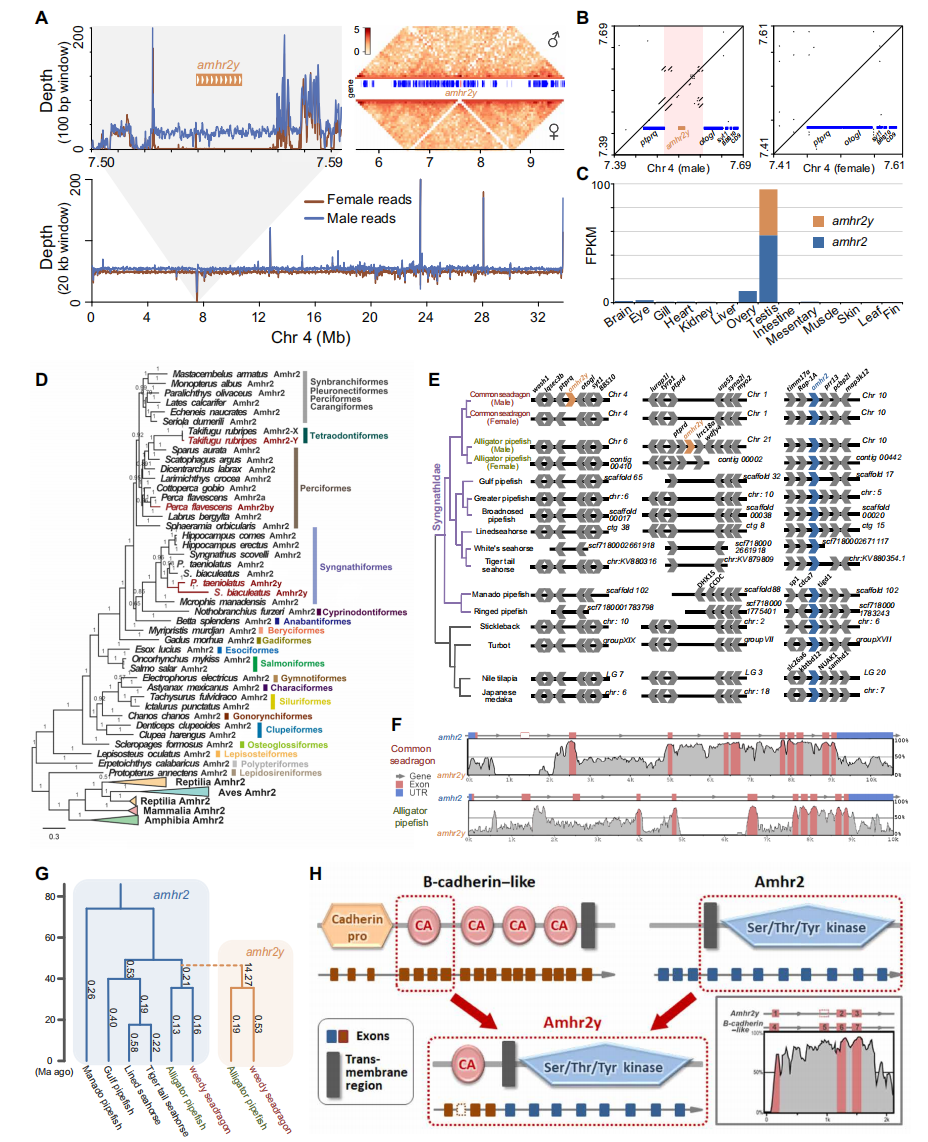 通過雄性和雌性葉海龍Illumina reads正反比對(duì)雄性和雌性的全基因組序列,來確定葉海龍中假定的性染色體和性別基因座。結(jié)果顯示Chr4上的一個(gè)~47-kb區(qū)域僅在雄性中存在, 且reads覆蓋度為Chr4平均值的一半,該片段經(jīng)Hi-C互作分析結(jié)果支持。注釋及比較分析發(fā)現(xiàn)草海龍和綠海龍的性別決定基因均為amhr2的雄性特異性拷貝amhr2y,但兩者的基因座不相同。系統(tǒng)發(fā)育分析表明,amhr2y起源于它們最近共同祖先的重復(fù)事件,而黃鱸amhr2y是從其譜系中的獨(dú)立重復(fù)事件進(jìn)化而來。研究發(fā)現(xiàn)amhr2y比amhr2受到的選擇壓力更強(qiáng),其整體結(jié)構(gòu)與amhr2相似。