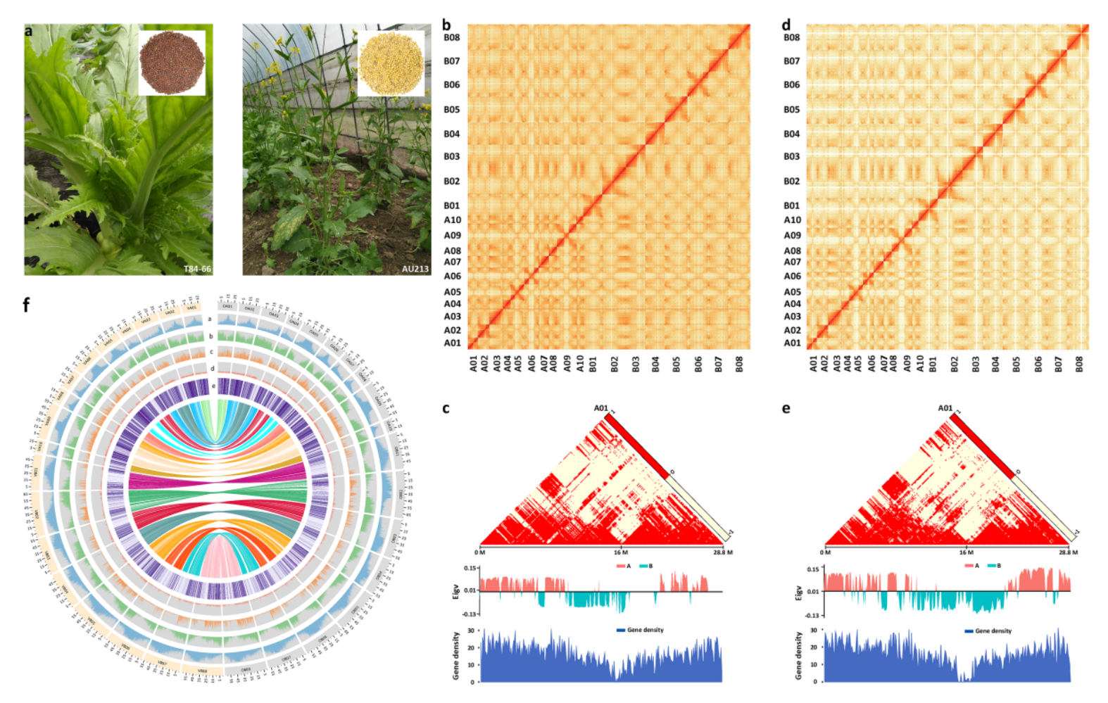 本研究在首次完成榨菜基因組組裝基礎(chǔ)上(Nature Genetics,2016 【項(xiàng)目文章】NG芥菜基因組文章解讀),進(jìn)一步優(yōu)化與解析低硫苷油用芥菜變種AU213的染色體水平基因組。調(diào)研圖評(píng)估菜用與油用芥菜大小結(jié)果分別為968 Mb與938 Mb,且contigN50分別為3.36 Mb及4.4 Mb,*大的scaffold近乎跨越了完整的染色體序列。T84-66與AU213基因組BUSCO(97.7 %與98.3%)、CEGMA(99.6 %與99.8 %)、二代數(shù)據(jù)回比(97.12 %與96.18 %)、GOGGs驗(yàn)證以及與前期基因組版本比較等方式,共同表明本次基因組組裝的高完整性。兩種芥菜中分別預(yù)測(cè)了100,829及100,048個(gè)基因,與16年已發(fā)表的 T84-66 (V1) 版本相比有所增加。芥菜型油菜的Hi-C圖譜顯示常染色質(zhì)(A)和異染色質(zhì)(B)的分布對(duì)比顯示,在著絲粒附近的異染色質(zhì)狀態(tài)中具有相對(duì)較低的基因表達(dá)模式。