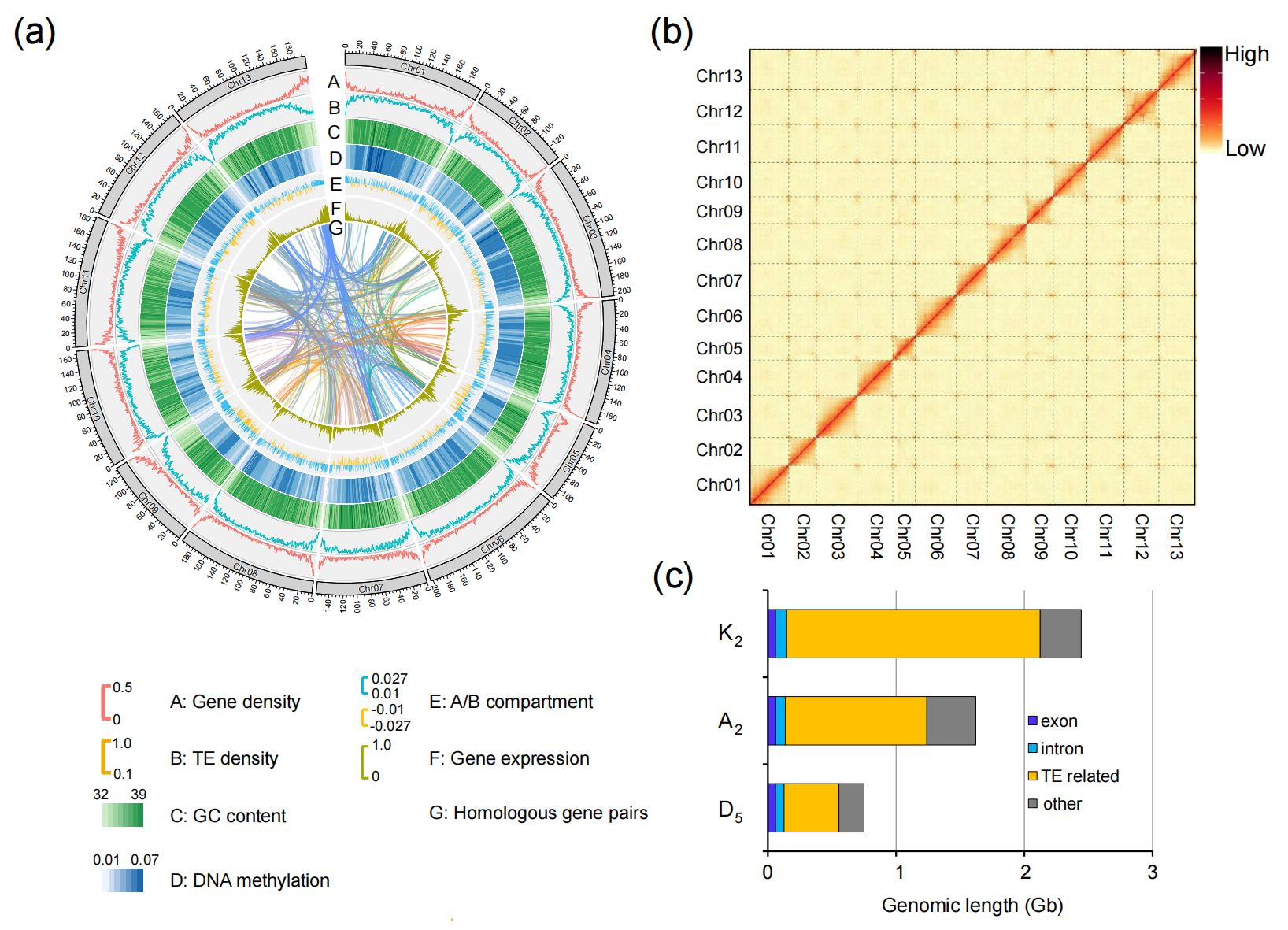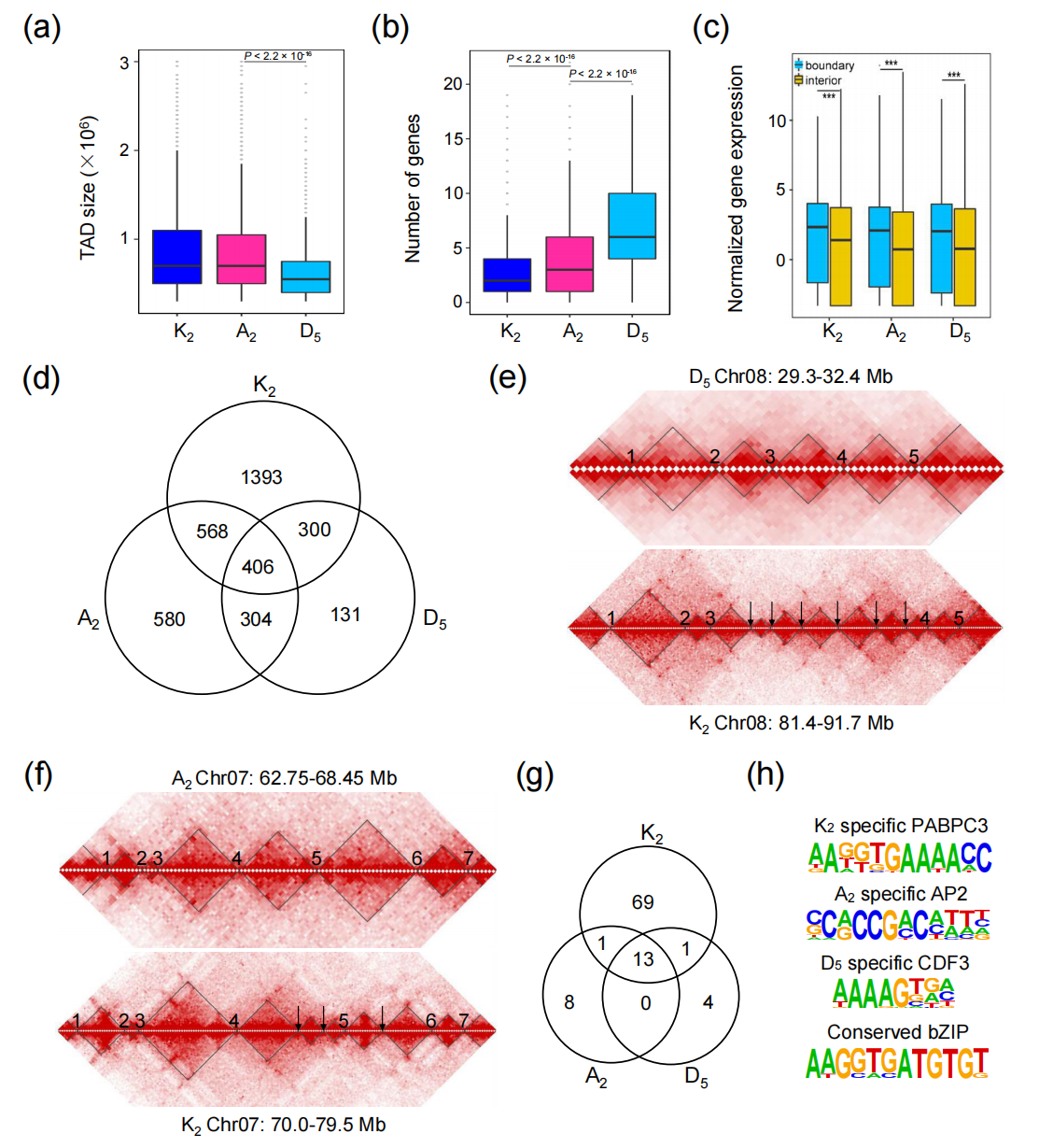 通過HiC染色質(zhì)互作數(shù)據(jù)揭示三個(gè)棉種染色體大小的規(guī)律,A2與K2比D5多了約7000個(gè)基因,三個(gè)基因組中17%的共線性同源基因表現(xiàn)為A/B區(qū)室的染色質(zhì)狀態(tài)改變,這與活躍的轉(zhuǎn)座子擴(kuò)增相關(guān)。