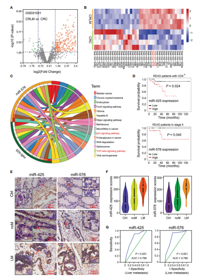 為了驗證這兩種miRNA的差異表達(dá),作者收集了157例CRC患者癌組織及癌旁組織。TMA和ISH試驗顯示,與對照相比miR-425和miR-576在CRC患者中高表達(dá)尤其是肝轉(zhuǎn)移患者(圖1E和F)。ROC曲線計算miR-425和miR-576基于肝轉(zhuǎn)移及其他相關(guān)危險因素線下面積,初步確定其在CRLM中的可信診斷能力(圖1G)。