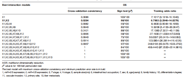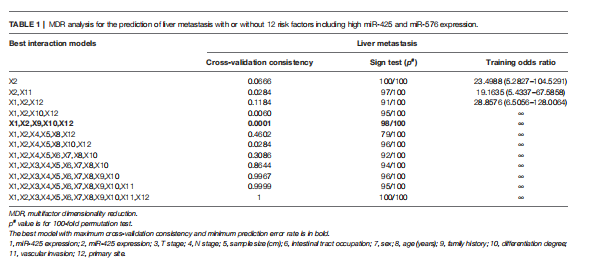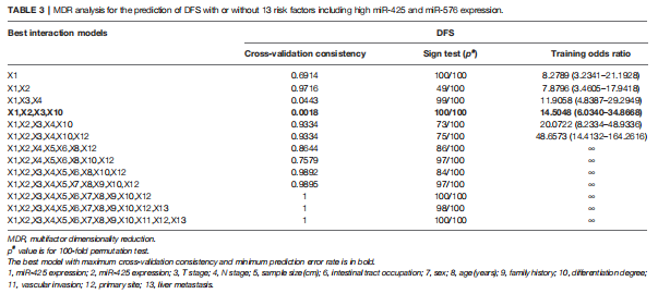 MDR分析顯示,miR-425、miR-576與家族病史、分化程度、原發(fā)部位聯(lián)合使用是評估肝轉(zhuǎn)移風(fēng)險的最佳預(yù)測模型,其交叉驗證一致性(CVC)最高,預(yù)測誤差最?。ū?)。這些結(jié)果提示miR-425和miR-576高水平的CRC患者特別容易發(fā)生肝轉(zhuǎn)移。