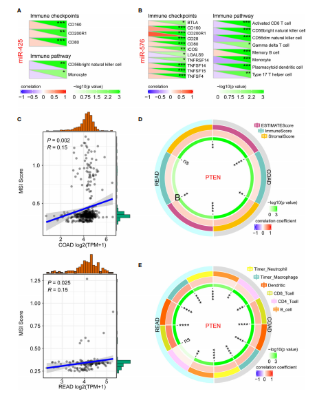 為了進(jìn)一步研究miR-425和miR-576在CRLM發(fā)生和發(fā)育的免疫調(diào)節(jié)中的重要作用,作者首先分析了miR-425和miR-576與相關(guān)指標(biāo)的相關(guān)性。因此,miR-425在CRC進(jìn)展中與免疫檢測點密切相關(guān),如CD160、CD200R1和CD80及免疫通路包括CD65自然殺傷細(xì)胞和單核細(xì)胞(圖6A)。MiR-425與檢測點和通路存在顯著相關(guān)性(圖6B)。此外,作者進(jìn)一步發(fā)現(xiàn)腫瘤抑制因子PTEN與MSI、TME、免疫細(xì)胞浸潤呈正相關(guān),從免疫的角度闡明了PTEN對CRLM的調(diào)控作用(圖6C-E)。以上結(jié)果表明,miR-425/ miR-576介導(dǎo)的PTEN抑制通過觸發(fā)免疫逃逸促進(jìn)CRLM過程。