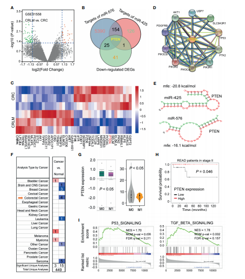 為了闡明miR-425和miR-576介導(dǎo)肝轉(zhuǎn)移和不良預(yù)后的有意義的下游靶點,作者在GSE81558 (n = 6)數(shù)據(jù)集上繪制火山圖,分析CRC組織和癌旁組織之間的DEGs(圖4A)。PTEN是CRLM中顯著下調(diào)基因與miR-425和miR-576靶基因的交集(圖4B)。聚類熱圖顯示在CRLM中PTEN的下調(diào)最顯著(圖4C)。進(jìn)一步檢索STRING發(fā)現(xiàn)與PTEN互作的關(guān)鍵蛋白(圖4D)。配對序列間的有效MFEs分別為?20.8和?16.1 kcal/mol(圖4E)。進(jìn)一步分析發(fā)現(xiàn),基于TCGA數(shù)據(jù)庫PTEN在幾種類型的腫瘤中表達(dá)顯著下調(diào)(圖4F),PTEN表達(dá)越低易發(fā)生腫瘤轉(zhuǎn)移且預(yù)后越差(圖4G和H)。此外,基于GSE62321 (n = 26)數(shù)據(jù)集,PTEN與miR-425和miR-576一致,證實PTEN正向參與P53、TGF-β信號通路,在腫瘤轉(zhuǎn)移中發(fā)揮有意義的作用(圖4I)。這些結(jié)果表明,PTEN下調(diào)是CRLM中miR-425和miR-576的共同靶點,導(dǎo)致臨床結(jié)果不佳。