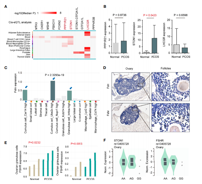 圖F 來自正常卵巢組織的 rs13405728 位點(diǎn)的 STON1 和 FSHR 的單組織 eQTL 分析。PCOS,多囊卵巢綜合征;eQTL,表達(dá)數(shù)量性狀基因座。