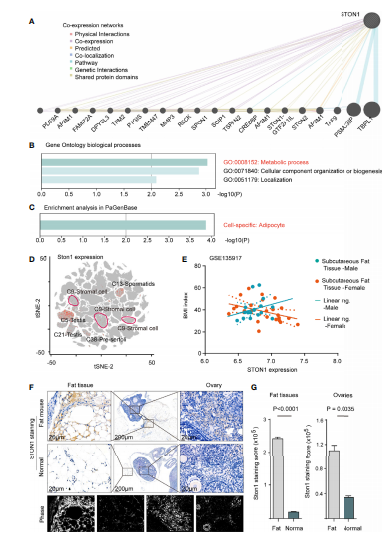 由于 STON1 在 PCOS 中的生物學(xué)作用尚不清楚,文章在公共數(shù)據(jù)集中進(jìn)行了 STON1 的共表達(dá)網(wǎng)絡(luò),以分析 STON1 在細(xì)胞中的分子功能(圖 3A)。GO 生物過程分析表明 STON1 的共表達(dá)基因與代謝過程 (GO:0008152, P = 0.0008)、細(xì)胞成分組織或生物發(fā)生 (P = 0.001) 和定位 (P = 0.007) (圖 3B) 相關(guān)。PaGenBase 中的富集分析表明,網(wǎng)絡(luò)的細(xì)胞特異性富集在脂肪細(xì)胞中(P = 0.0001,圖 3C)。
