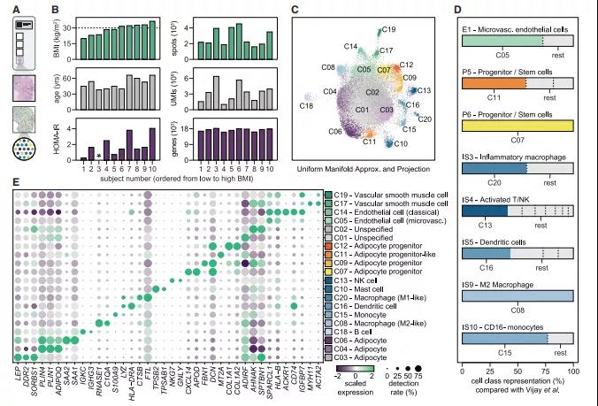 作者使用10x Genomics Visium平臺對?WAT中的細胞類型的異質性和空間位置進行了研究。通過穿刺活檢獲得體重指數、年齡和對胰島素敏感性均有差異的10個人的腹部皮下WAT樣本。對其覆蓋27,937個spots的數據進行空間轉錄組分析,結果發(fā)現(xiàn)每個切片平均檢測17,303個獨特基因和3,280,607個UMIs(圖1B)。通過對數據進一步分析,共鑒定了?20種不同的細胞類群(C01-C20;圖1C),且存在于所有捐助者中。接下來,將目前的結果與最近發(fā)表的人類WAT間質血管的單細胞數據進行整合分析?,結果表明,空間數據包含了內皮細胞、免疫細胞和祖細胞的特定群體(圖1D)。人工注釋標記基因協(xié)助作者對20類細胞類型進行標注(圖1E),主要包括免疫細胞(單核細胞[C15], Ml-like[C20]和 M2-like 巨噬細胞[C08],樹突細胞[C16],肥大細胞[C10], B細胞[C18]和NK細胞[C13]),血管細胞(微血管 [C05]和經典[C14]內皮細胞和血管平滑肌細胞[C17 / C19])和脂肪細胞祖細胞(C07 / C09 / C12)。在后者中,C07表達成熟的前脂肪細胞/脂肪干細胞標記物,C09表達編碼纖維化和細胞外基質蛋白的轉錄本,而C12是前兩者的混合。一個祖細胞類群(C11)富集了多個編碼金屬硫蛋白的基因,在立體分析中將其歸為祖細胞(圖1D)。然而,在UMAP中,它從其他三個祖細胞中分離出來,因此,作者確定了其特征基因在脂肪生成的整體轉錄譜和WAT的不同組分中的表達。這些分析證實了C11在脂肪祖細胞中富集,并在人類脂肪形成過程中瞬時表達。