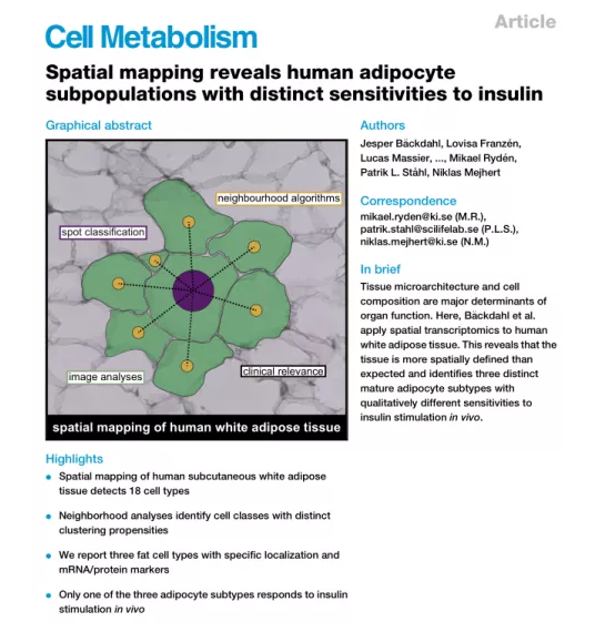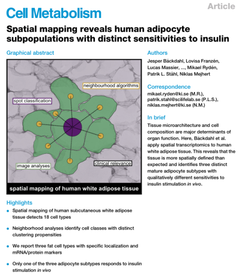 中文題目:空間圖譜揭示人類脂肪細胞亞群對胰島素有不同的敏感性 期刊名稱:Cell Metabolism