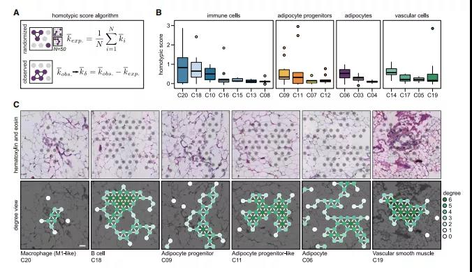 ? ? ? ?為了確定不同細胞類型之間的空間關系,作者還開發(fā)了一種算法對異型鄰域分析 (圖3A),揭示了幾種關聯(lián)性(圖3B,3C)。正如預期的那樣,較大血管結構 (C14/C17/C19)彼此之間的距離比與血管樣組織的距離更加靠近;M2-like巨噬細胞(C08)經常位于兩種脂肪祖細胞附近:C09的同型簇(圖3C)和分散的C12,這與小鼠研究一致。此外,樹突狀細胞(C16)與其他免疫細胞表現(xiàn)出較高的異型評分,而兩類成熟脂肪細胞(C03/C04)相互共定位,并與C06脂肪細胞明顯分離。總之,異型鄰域分析表明,WAT的空間定義比預期的更明確,具有特定的細胞-細胞關系。