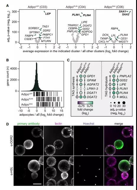 ? ? ? ? ? ?作者的分析確定了三種不同類型的成熟脂肪細胞,它們具有不同的轉錄譜和空間排列。作者進一步定義了每個亞型的標記基因(圖4A),結果發(fā)現(xiàn)了LEP(編碼脂肪因子瘦素)、PLIN1/PLIN4(編碼脂滴蛋白perilipin-1和-4)和SAA1/SAA2(編碼血清淀粉樣蛋白A1和A2急性期蛋白質)是各分類中最獨特的基因。因此,作者將這些亞群體命名為Adipo LEP、Adipo PLIN和Adipo SAA。如結果所示,Adipo LEP富集了細胞-細胞/基質細胞相互作用蛋白和瘦素信號/分泌調節(jié)基因。AdipoPLIN標記基因與葡萄糖和脂質代謝以及脂肪因子脂聯(lián)素相關。雖然Adipo SAA與Adipo PLIN有一些共同的標記基因,但這類基因也富集了多種與視黃醇代謝及結合的多種脂肪因子和酶。為了證實這三種亞型的標記基因在成熟脂肪細胞中表達,作者分析了大量配對樣本的轉錄組學數據,比較了從WAT中分離的脂肪細胞和非脂肪細胞。相關數據表明,50個標記基因在脂肪細胞中富集(圖4B),說明Adipo LEP、AdipPLIN和AdipoSAA代表不同類型的脂肪細胞。空間數據的進一步分析顯示,這些亞型表現(xiàn)出相互的表達模式(圖4C)。作者用針對AdipoLEP(DDR2)和Adipo PLIN (HSL,由LIPE編碼)標記蛋白的抗體對從人皮下WAT分離的成熟脂肪細胞進行染色,驗證了該結果(圖4D)。此外,還使用針對CD36(Adipo PLIN的標記物)和 CSDEl(Adipo LEP的標記物)的抗體對人類成熟脂肪細胞進行了免疫共標記,觀察到其相互的染色模式。對于Adipo SAA,作者進行了多種抗體的測試,但沒有一種抗體顯示出足夠的特異性。綜上所述,空間數據可在蛋白質水平上進行概述,并支持所鑒定的脂肪細胞具有不同表達譜的亞群。