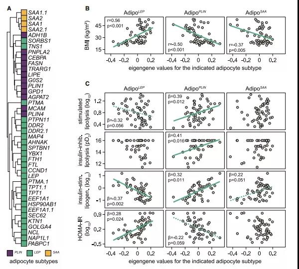 ? ? ? ??接下來,作者的目標是了解脂肪細胞亞型對組織功能的貢獻。為深入了解脂肪細胞亞型方面的功能,作者對56女性的WAT轉錄組數據進行了綜合分析,其中還對新鮮分離的脂肪細胞進行了脂肪分解/脂肪生成測量。在比較56名女性數據時,Adipo PLIN、Adipo LEP和Adipo SAA標記基因形成了單獨的、共同調控的集群(圖6A),可用來確定細胞類型豐度和脂肪細胞表型之間的關系。與空間數據一致 ,Adipo PLIN在肥胖人群中的比例降低,分析顯示Adipo PLIN與BMI之間負相關,AdipoSAA與BMI也呈負相關,而AdipoLEP呈正相關(圖6B)。