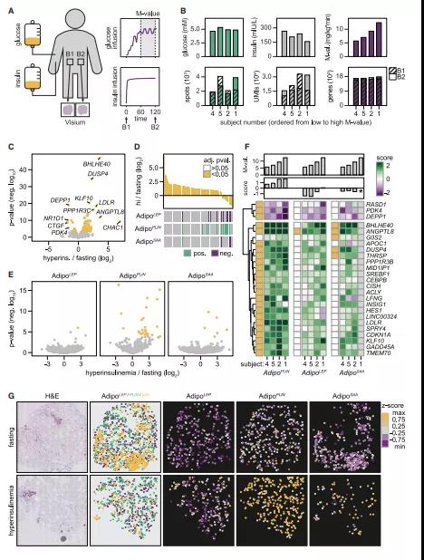 ? ? ? ??在脂肪細胞中,兒茶酚胺刺激脂肪分解,胰島素抑制脂肪分解促進脂肪生成。通過校正BMI(圖6c),作者觀察到AdipoPLIN和兩種脂解指標之間存在正相關,而AdipoLEP與這些參數沒有或弱負相關。對于胰島素刺激脂肪生成,研究發(fā)現(xiàn)Adipo PLIN與此指標呈正相關,AdipoLEP呈負相關。相比之下,AdipoSAA與任何研究參數均無顯著相關性??傊@表明Adipo PLIN與AdipoSAA相比,Adipo PLIN與更明顯的胰島素反應有關。為了在人體內測試這一發(fā)現(xiàn),作者在高胰島素-微生物-正血糖鉗夾2小時后,從10個個體中的4個收集了 WAT樣本,并進行了空間轉錄組分析(圖7A,7B)。穩(wěn)定狀態(tài)下的胰島素平均濃度是空腹狀態(tài)下的10倍,從葡萄糖處理率(m值)可以看出,4例患者均表現(xiàn)出明顯的胰島素敏感性(圖7B)。高胰島素血癥的空間數據與禁食狀態(tài)下獲得的樣本質量相似(圖7B),兩者的比較在基因表達水平上明確了胰島素反應(圖7C)。這些數據與之前報道的高胰島素鉗夾隊列的大量組織RNA測序顯示出一致的結果,表明空間分析捕捉到了胰島素的急性反應。盡管胰島素誘導了一個快速的轉錄反應,但在這個時間框架內,它本身并不是脂肪細胞異質性的驅動因素(圖7D)。接下來,作者根據細胞類型進行胰島素反應分析。對于脂肪細胞,在AdipoPLIN中有多個基因對胰島素有顯著反應,AdipoSAA中變少,而AdipoLEP中只有一個基因(圖7E)。作者評估了個體間對胰島素的轉錄反應是否存在數量差異,分析結果表明,Adipo PLIN反映了 M-values值,但這在其他兩個亞型中不明顯(圖7F和7G)??傊@些數據表明,體內對胰島素的轉錄反應主要歸因于Adipo PLIN,而其他脂肪細胞亞型對高胰島素血癥仍然沒有反應。