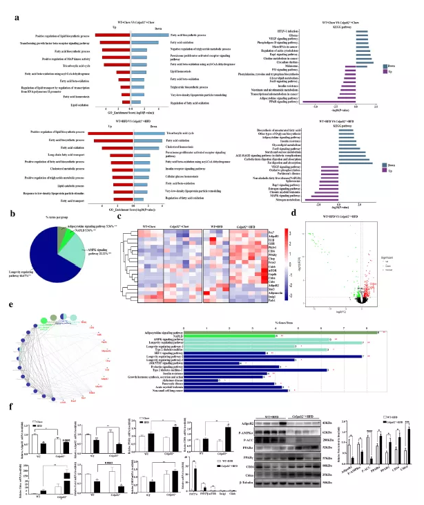 為了探索NAFLD中Colgalt2缺乏的潛在機(jī)制,作者對WT小鼠和飼喂HFD或標(biāo)準(zhǔn)飼料的Colgalt2?/?小鼠肝組織進(jìn)行ONT全長轉(zhuǎn)錄組測序。結(jié)果顯示,與WT小鼠相比,HFD喂養(yǎng)的Colgalt2?/?小鼠中有321個(gè)DEGs。為了明確DEGs的功能,分別對上調(diào)和下調(diào)的 DEGs進(jìn)行KEGG通路富集分析(P < 0.05) (圖5a)。對于上調(diào)的基因,KEGG分析顯示這些差異表達(dá)基因顯著富集于MAPK信號(hào)通路、NAFLD、和氧化磷酸化。下調(diào)的基因富集于脂肪消化和吸收、甘油脂代謝。在這些途徑中,19個(gè)差異表達(dá)基因與脂代謝密切相關(guān),包括adipoR1、adipoR2和脂質(zhì)合成相關(guān)的分子,包括Cidea和Cidec (FSP27)、Cd36和PPARγ(圖5c)。為了進(jìn)一步研究這19個(gè)基因在這些通路中的作用,使用ClueGO和CluePedia工具解讀這些通路網(wǎng)絡(luò)(圖5 d)。這些基因在AMPK信號(hào)通路、脂肪細(xì)胞因子信號(hào)通路和NAFLD等中富集(圖5 b和e)。