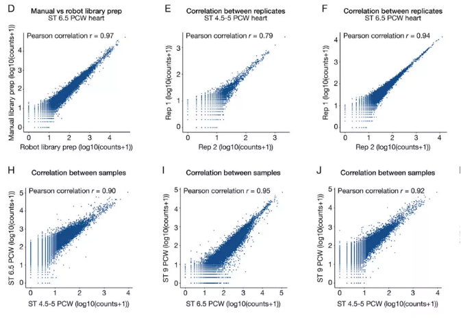 對同一樣本的 scRNA-seq 的基因表達數(shù)據(jù)與空間轉(zhuǎn)錄組的基因表達數(shù)據(jù)或者同一樣本的不同切片數(shù)據(jù)進行 Pearson 相關(guān)性分析,從而評估技術(shù)重復(fù)之間的相似性[1]。