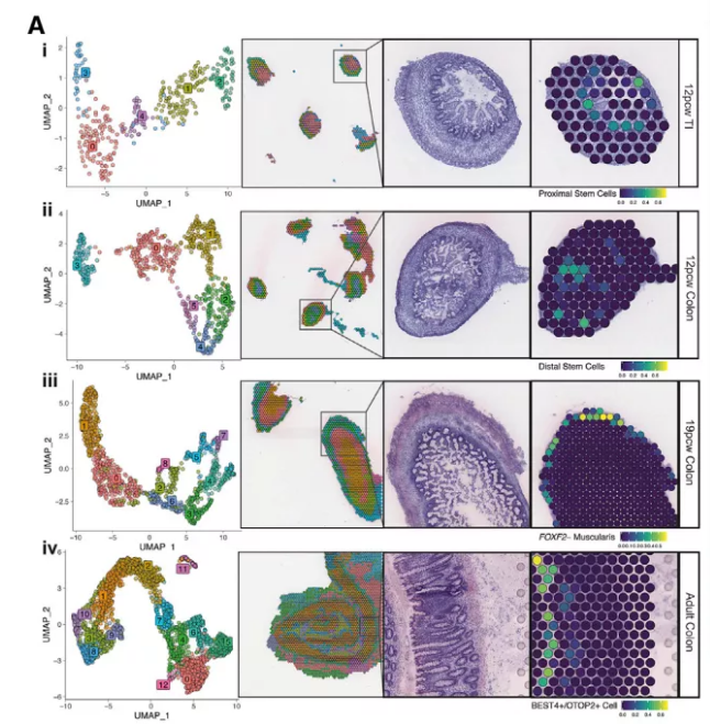 注:左側(cè)圖為ST的各個簇(cluster)的UMAP展示;左側(cè)中間圖為 clusters 在空間組織上的聚類可視化展示;右側(cè)圖為 ST 與 scRNA-Seq 細胞類型注釋結(jié)果的整合