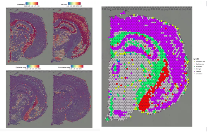 注:左圖展示單獨各個細胞類群在空間的分布情況,右圖為空間組織切片每個spot的細胞類型展示圖,不同顏色表示不同的細胞類型