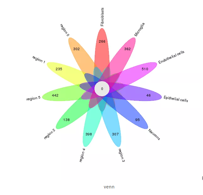 注:每個花瓣上的數(shù)字表示該細胞亞群或組織區(qū)域的差異基因總數(shù),中間圓心的數(shù)字表示所有細胞亞群與組織區(qū)域的交集基因數(shù)